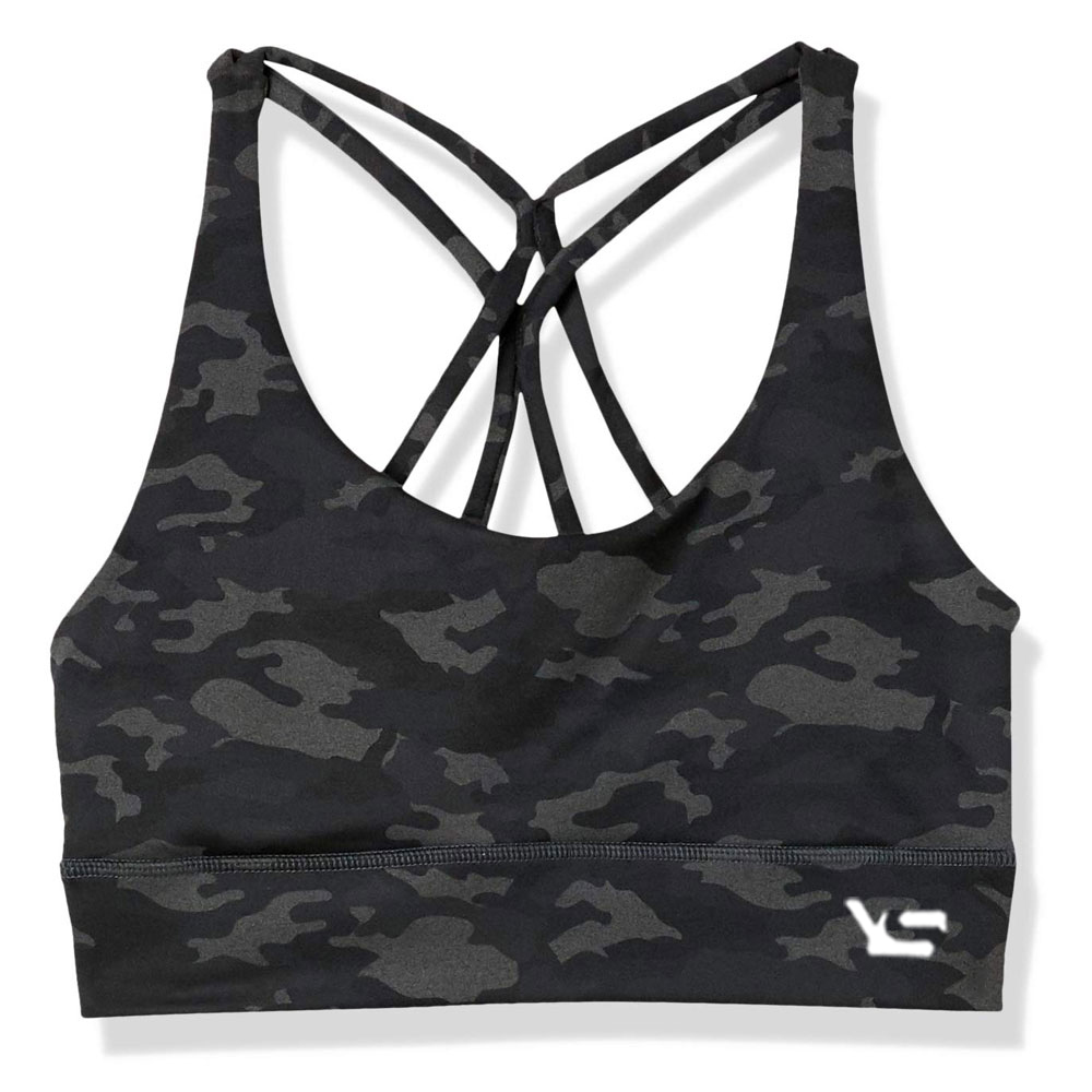 • Stylish black camo sports bra with criss-cross back straps